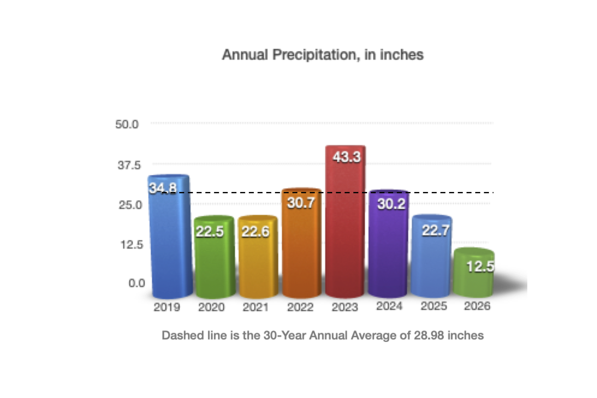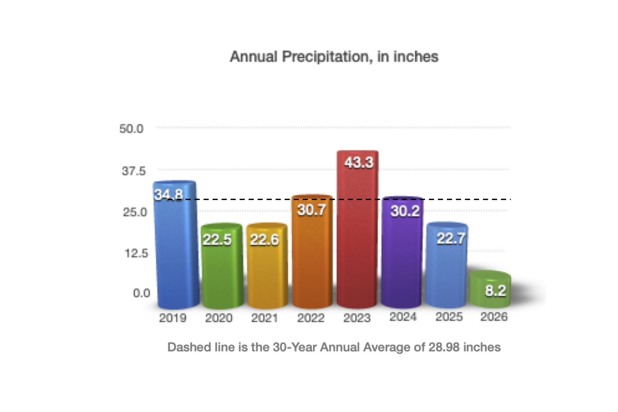 The annual water-year precipitation recorded in Timber Lakes during the past several years demonstrates how far below the 30-year average we are.