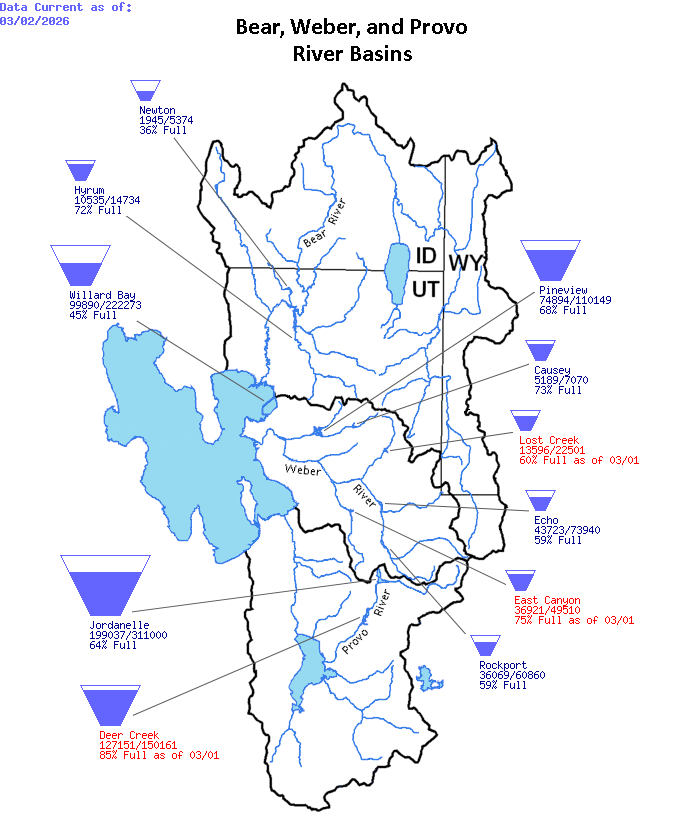 This teacup diagram depicts the current status of the reservoirs in our area, including the Bear River Basin, Weber River Basin, and Provo River Basin.5