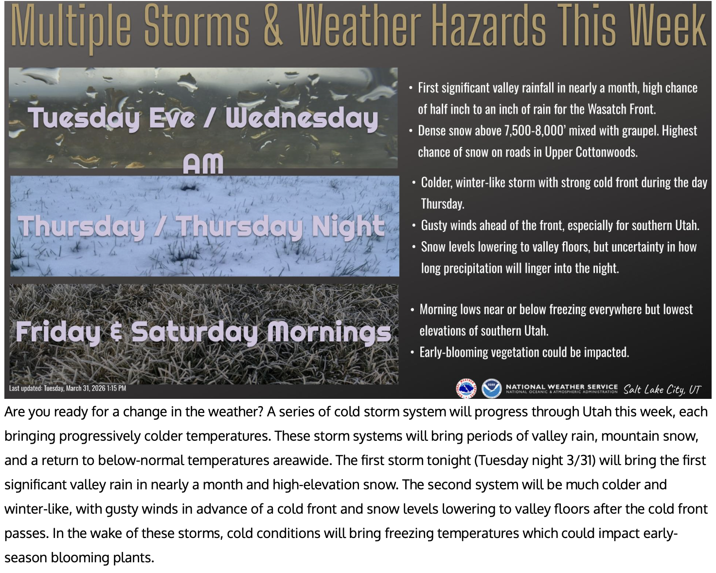 The Salt Lake City NWS Office also maintains an excellent website displaying weather watches, warnings, advisories, maps, and other information about various Utah weather-related items. Click here for the SLC NWS Wesbite.